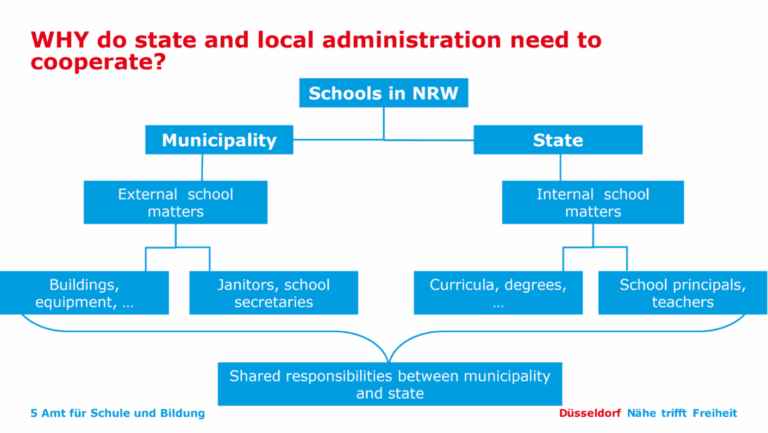 As noted above, the state of NRW bears the cost of paying for teaching staff, and other staff (e.g., social workers, custodians, secretaries) are funded by the local authorities. The chart below provides an overview of this governance structure in NRW.